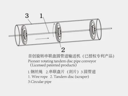 Тандемный дисково-трубчатый конвейер использует цепи или стальные тросы для тяги нескольких последовательно расположенных скребков внутри круглого канала.